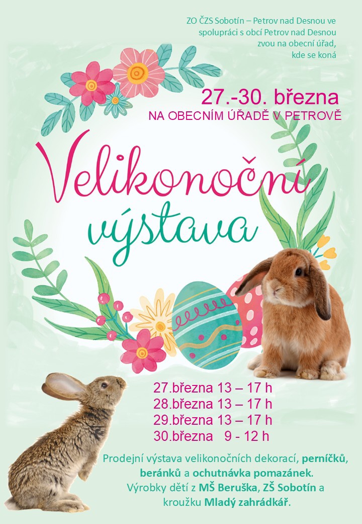 Velikonoční výstava ZO ČZS Sobotín-Petrov nad Desnou - výstava velikonočních dekorací a prací dětí z kroužku mladých zahrádkářů.