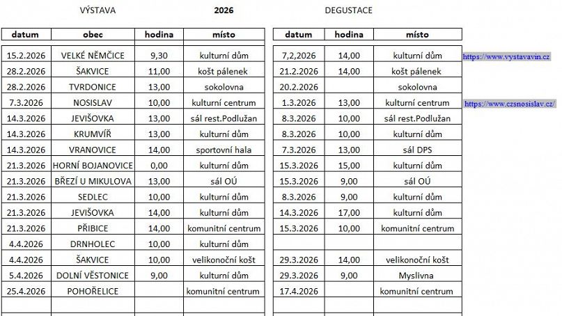 7. 2. Křepice, 15.2. Velké Němčice, 28.2. Tvrdonice, 7.3. Nosislav, 14.3. Jevišovka, 14.3. Krumvíř, ...