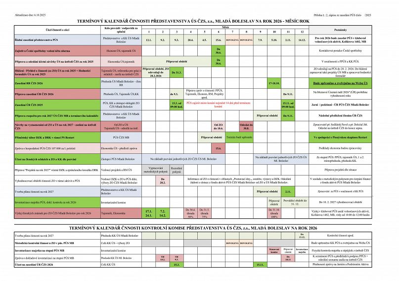 Tento kalendář je vždy projednán na zasedání PÚS Mladá Boleslav koncem roku (po uskutečnění podzimního zasedání územní rady)