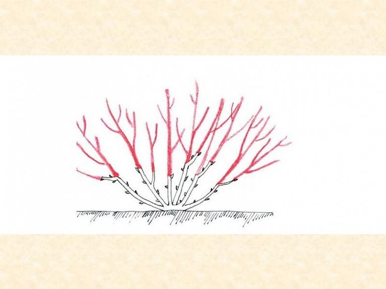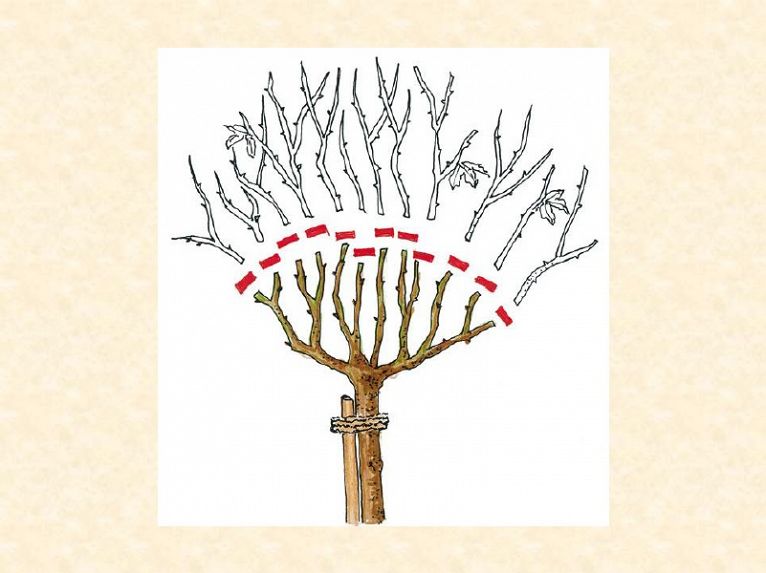 Na podzim není nutný, ale dobrý. Seřežeme asi na 30 cm, hodně pozdě ,až koncem listopadu. Na jaře (od konce února do poloviny dubna) řez provedeme až na 15 cm. Odstraníme vše, co roste dovnitř, všechny tenké větvičky (vousy). Necháme jen silné, zdravé větvičky, na celé rostlině max 15 pupenů.