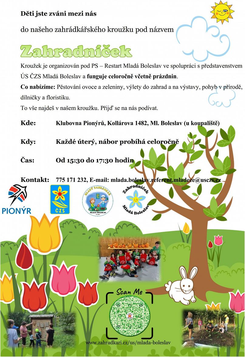 Zřizovatelem dětského zahrádkářského kroužku je představenstvo územního sdružení Českého zahrádkářského svazu z. s. Mladá Boleslav Ev. č.: 107 000, IČ 00433241, Vedené ve Veřejném rejstříku u Městského soudu v Praze 3 pod spisovou značkou: L 43689. Kontakt na sídlo naší organizace naleznete v menu "O nás" a dále v zápatí této webové stránky. Partnerskou organizací, která nám poskytuje zázemí (klubovnu) zejména pro podzimní, zimní a část jarního období je organizace Pionýr z. s., konkrétně 1. PTS Táborník Mladá Boleslav. S touto organizací již nějaký čas spolupracujeme mimo jiné na společných projektech v oblasti práce s mládeží, účastníme se společných porad a akcí v průběhu roku. Těšíme se na další spolupráce ve prospěch dětí a jejich rodičů v rámci volnočasových aktivit.