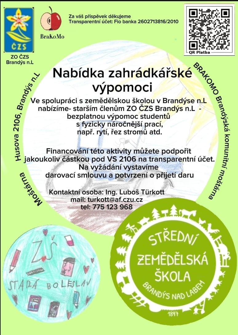 Ve spolupráci s zemědělskou školou v Brandýse n.L. nabízíme- starším členům ZO ČZS Brandýs n.L - bezplatnou výpomoc studentů s fyzicky náročnější prací, např. rytí, řez stromu atd.