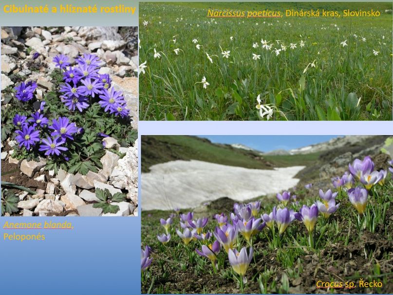 (Globularia alypum), Sarcopoterium spinosum, sasanky (Anemone), asfodely