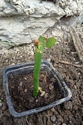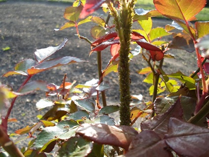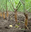 Místo očkování 1 palec nad úrovní země. Když se zasadí hluboko pustí kořeny z roubu což je nežádoucí. Kořeny zakrátím jen o poškozenou část. díra na vysazení musí být dostatečně velká, aby se kořeny neohýbaly. Přihrneme zeminou přišlápneme uděláme mísu na zalévání a zalejeme.