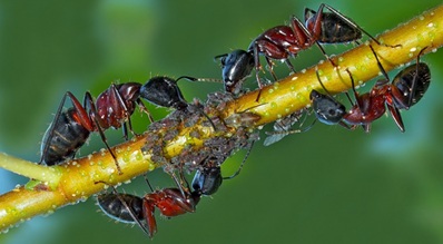 Mšice (přípravek karate). Mravenci je chovají, sluníčko sedmitečná je žerou. Mšice roznáší virózy