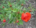 Až 2 m vysoký keř, hustě olistěný, květy – velké, tmavě růžové, má kultivary červené, bílé, jednoduché, plné. Jje odolná, má plno malých trnů sázet max do dvojřádků kvůli uklízení. Kvete