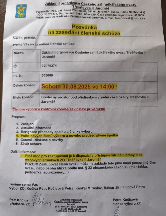 Základní organizace Českého zahrádkářského svazu Třešňovka II Jaroměř č: 505009